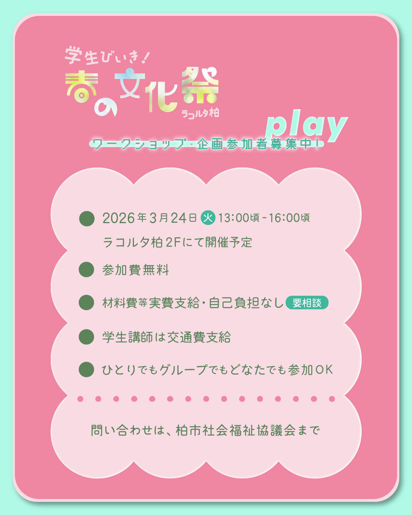 【問合せ先】柏市社会福祉協議会Email:tasedai@kashiwa-shakyo.or.jp