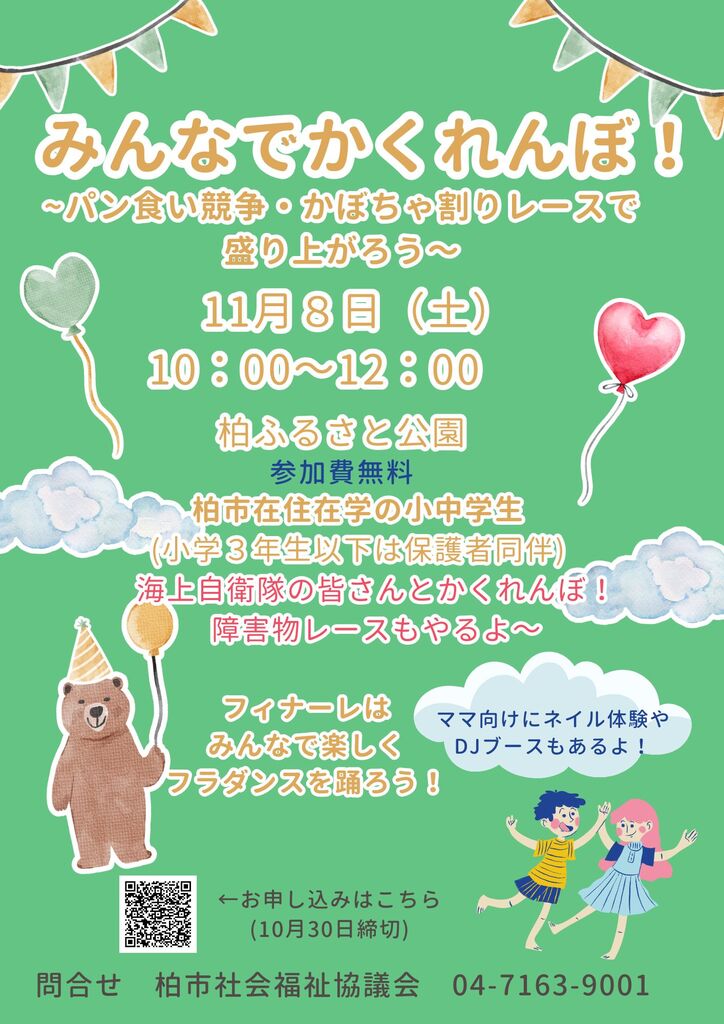 海上自衛隊のみなさんがかくれ、参加者さんが探そう!全員見つけられたらパン食い競争やかぼちゃ割り(割ったかぼちゃの中身はお楽しみに)で盛り上がろう!